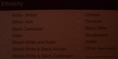 Auf meinem Immatrikulationsantrag war auch das Feld "ethnic origin" (= ethnischer Ursprung) mit einer zweistelligen Zahl auszufüllen - Erklärungen umseitig. Auf der Rückseite fand sich folgende Auflistung, die ich Euch nicht vorenthalten will: